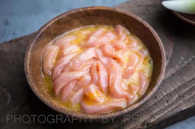 2.里脊肉切成条状,打入一枚鸡蛋,加入料酒、盐、胡椒粉