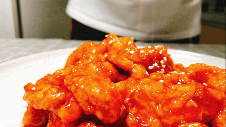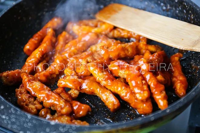 7.锅中留少许油,加入番茄酱、白醋、盐、糖、少许水,用水和淀粉调成糖醋汁,接着下入炸好的里脊快速翻炒均匀后出锅