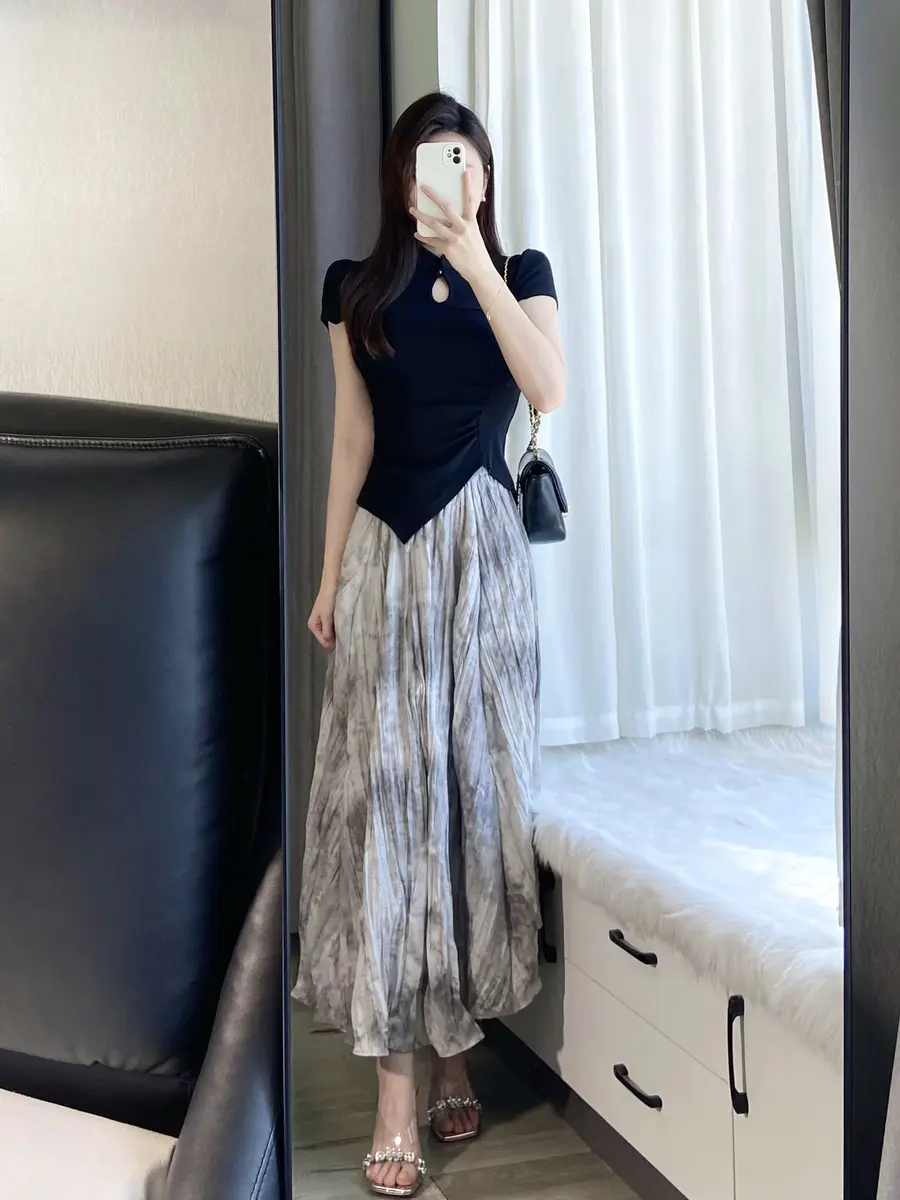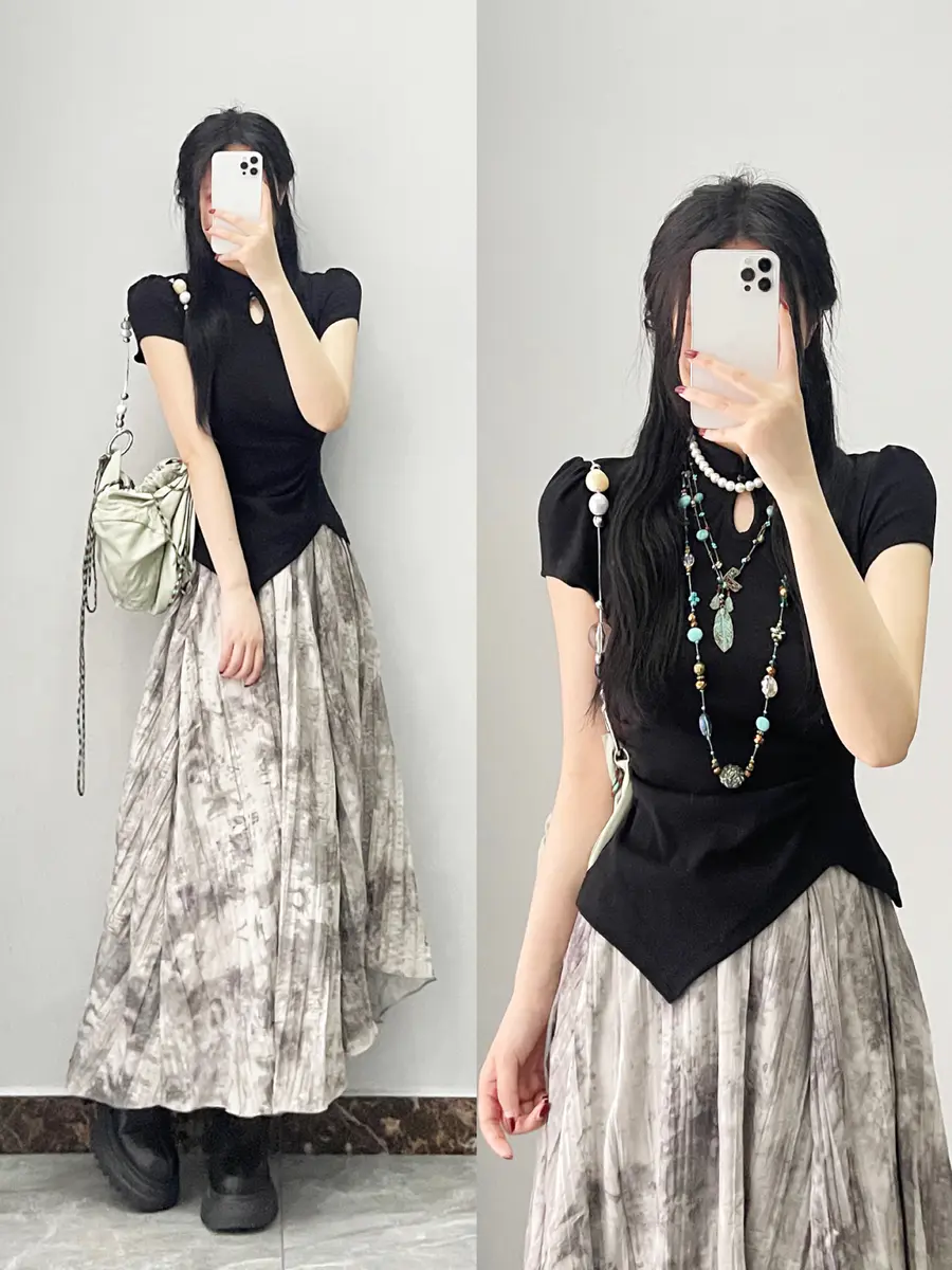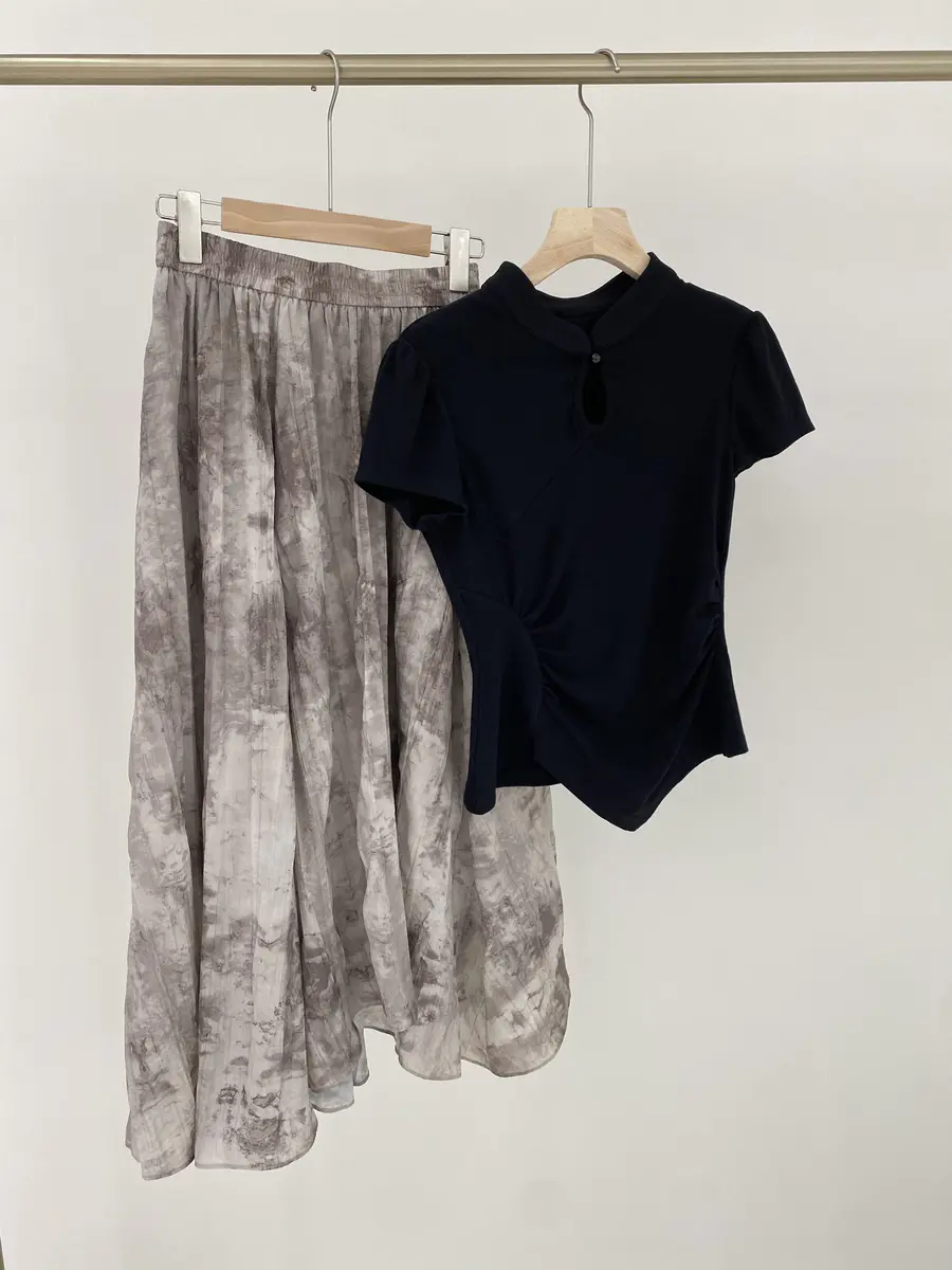 搭配暮霭沉沉晕染半裙,日常中式韵味直接拿捏,褶皱的面料结合不规则裙摆,上身蓬蓬立体感十足,整套上小下A,很显腰身哦~