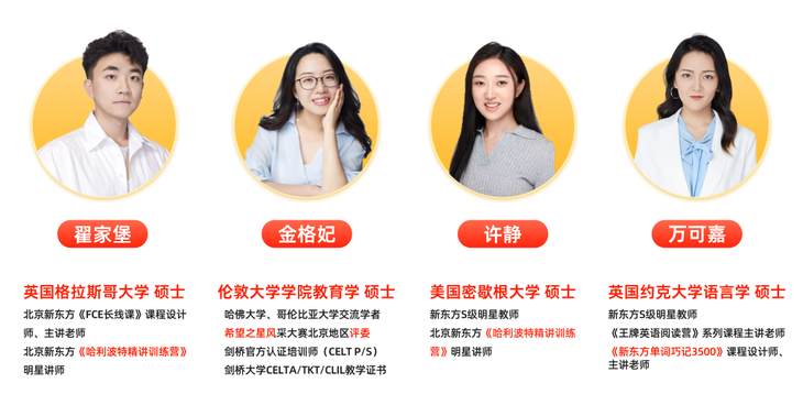 剑桥认证培训师、哈佛/哥大交流学者、英美名校硕士、明星讲师全程带学!