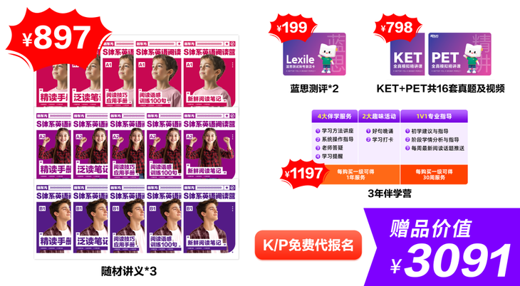 随材讲义+蓝思测评+KET/PET16套真题及视频+伴学营+KET/PET代报名服务