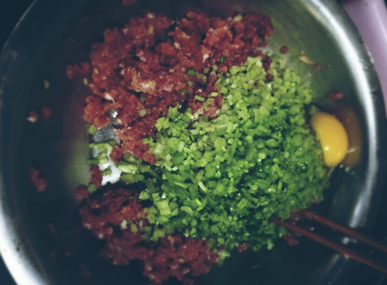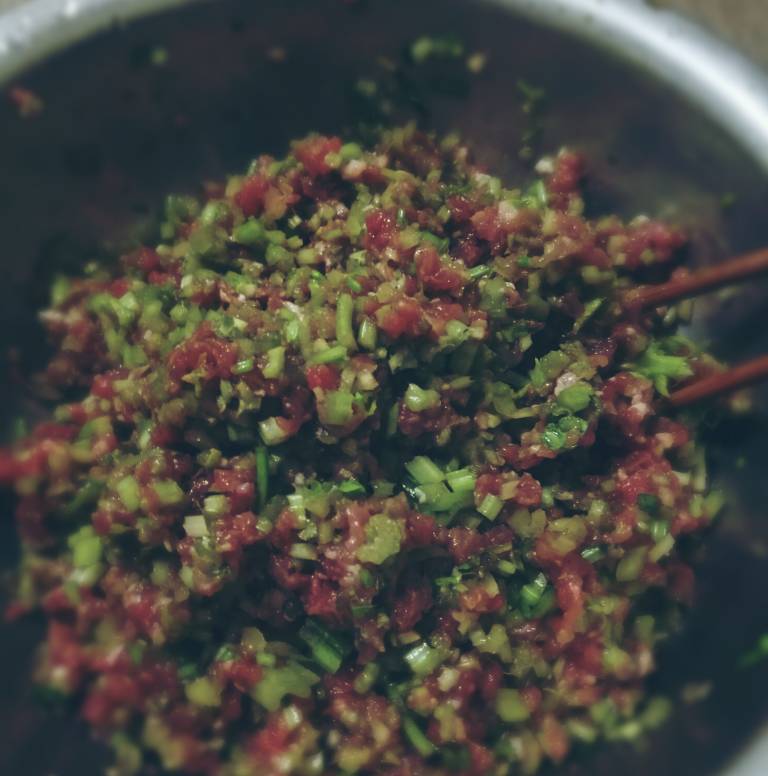 牛肉馅1斤,芹菜2小把;