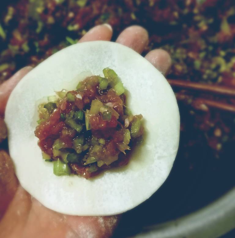 2、从冰箱取出饺子馅,开始包饺子;