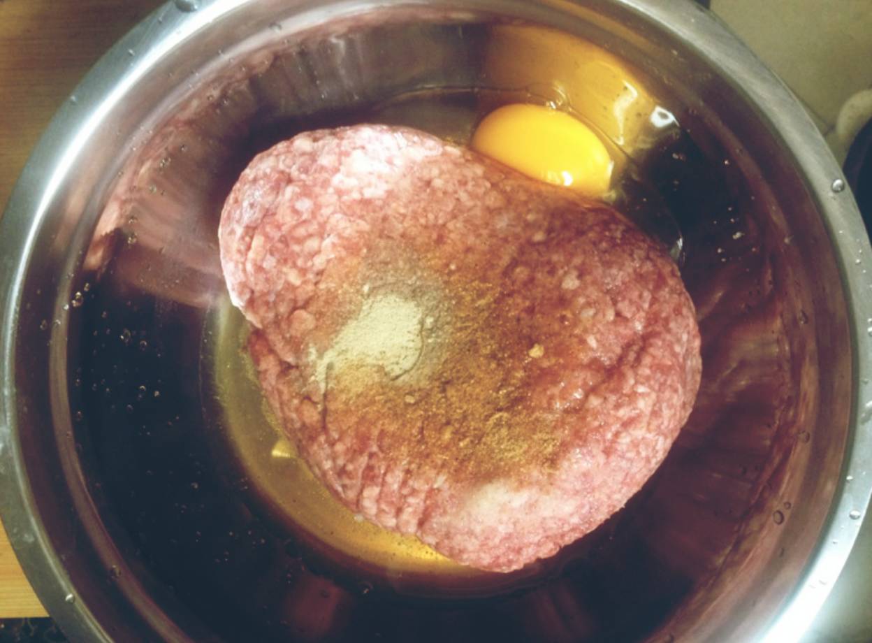1、把买好的牛肉馅放在碗里,打一个鸡蛋,1勺盐,少量的五香粉和白胡椒,再放一些料酒去腥味;