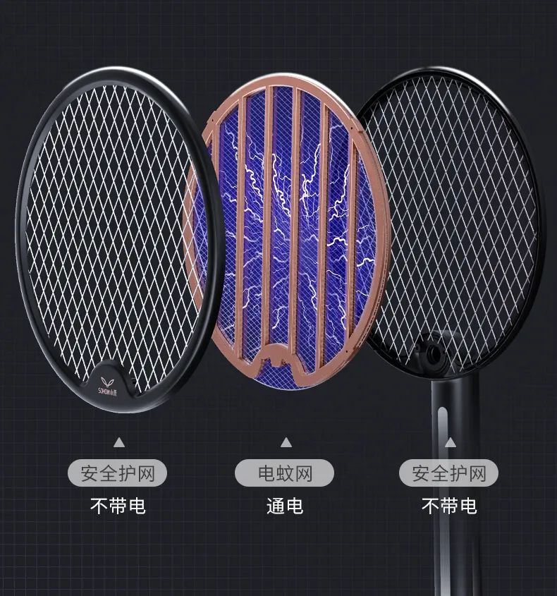 细节上,电蚊拍由3层防护安全网面组成,前后两面为安全防护网同为负极,人体接触无电流不会触电