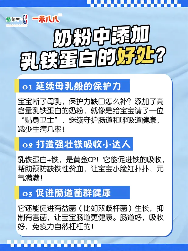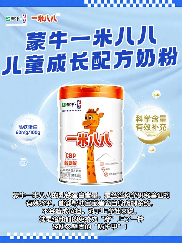 🎉️补充乳铁蛋白很重要,它是母乳里的免疫“主力军”,😘促进吸收、保护肠道!🥛蒙牛一米八八奶粉,科学补充无负担,💪增强宝贝抵抗力!