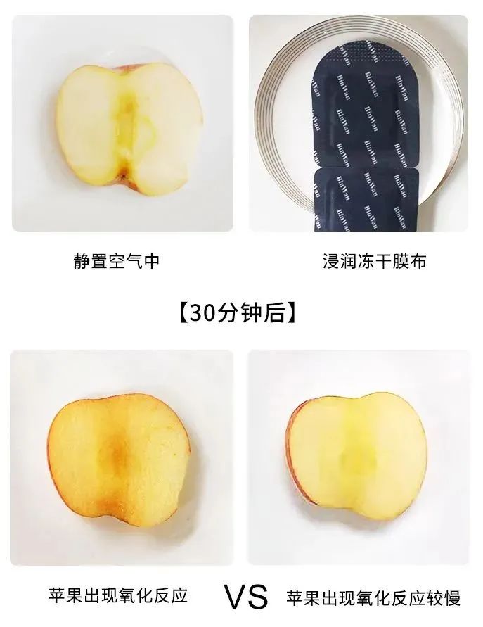 敷有冻干眼罩的苹果,30分钟以后跟刚切的一样新鲜水润,裸露在空气中的苹果则已经发黄发黑了。