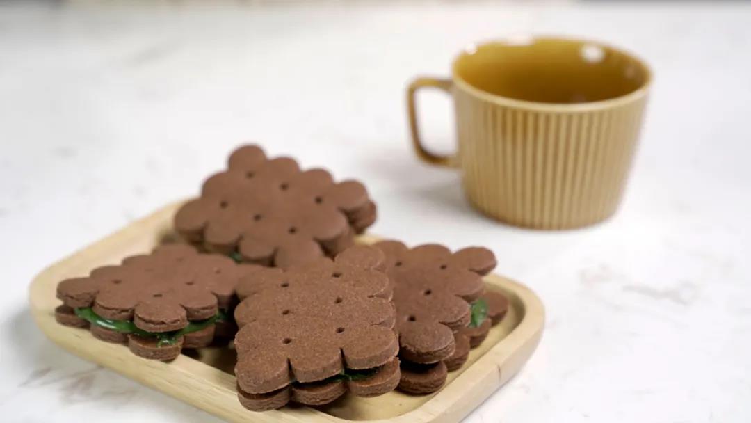 酥脆的曲奇饼干,有着浓郁的可可味,配上浓厚醇香的抹茶巧克力夹心,层次感十足且不失细腻。