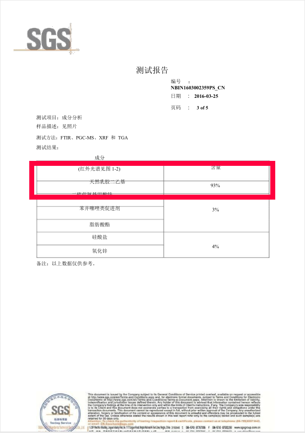 填充材料同样经过权威机构检测,天然乳胶含量为93%。