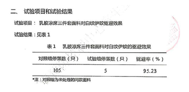 且驱蚊的功效不是随意讲讲的,有中疾控中心的检测报告为证:乳胶凉席面料防蚊效果检测驱蚊率达到95.234%。