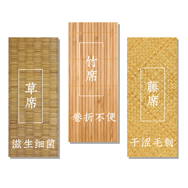 草席容易发霉,滋生细菌螨虫,皮肤脆弱的人容易皮肤瘙痒、长疙瘩、疹子;藤席硬的要命,存在倒刺,容易勾到头发和衣服~