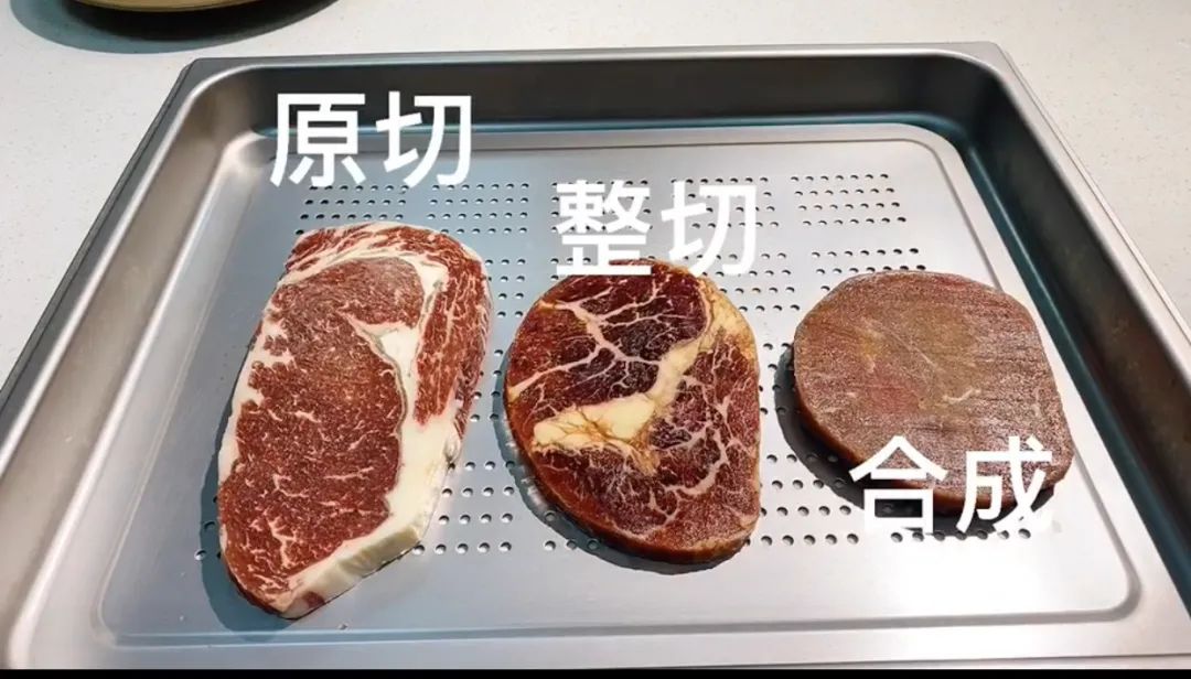合成调理牛排,是由多块牛肉,甚至是牛肉碎,用卡拉胶,拼接在一起的。这些牛肉都是一些很差的部位(说什么菲力,眼肉,西冷那真的是开玩笑了。),通过机器压制,粘合;加调料调味,嫩化,加工而成。