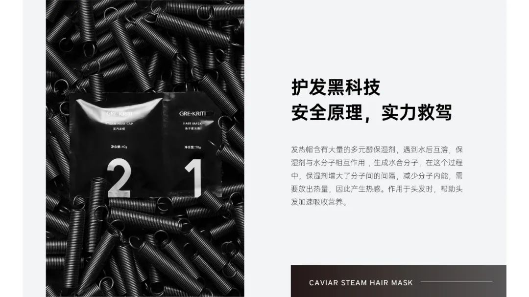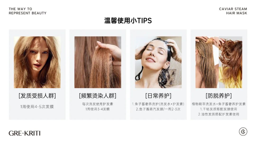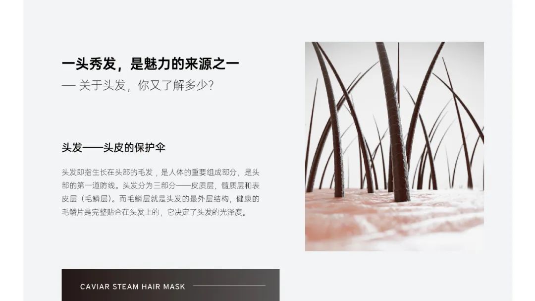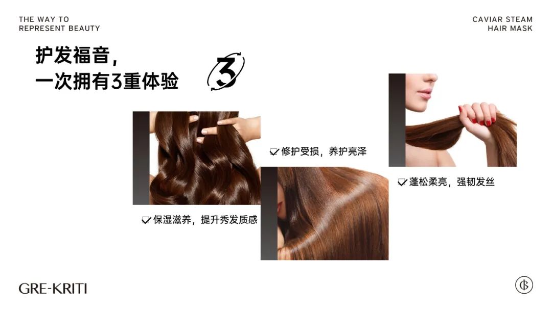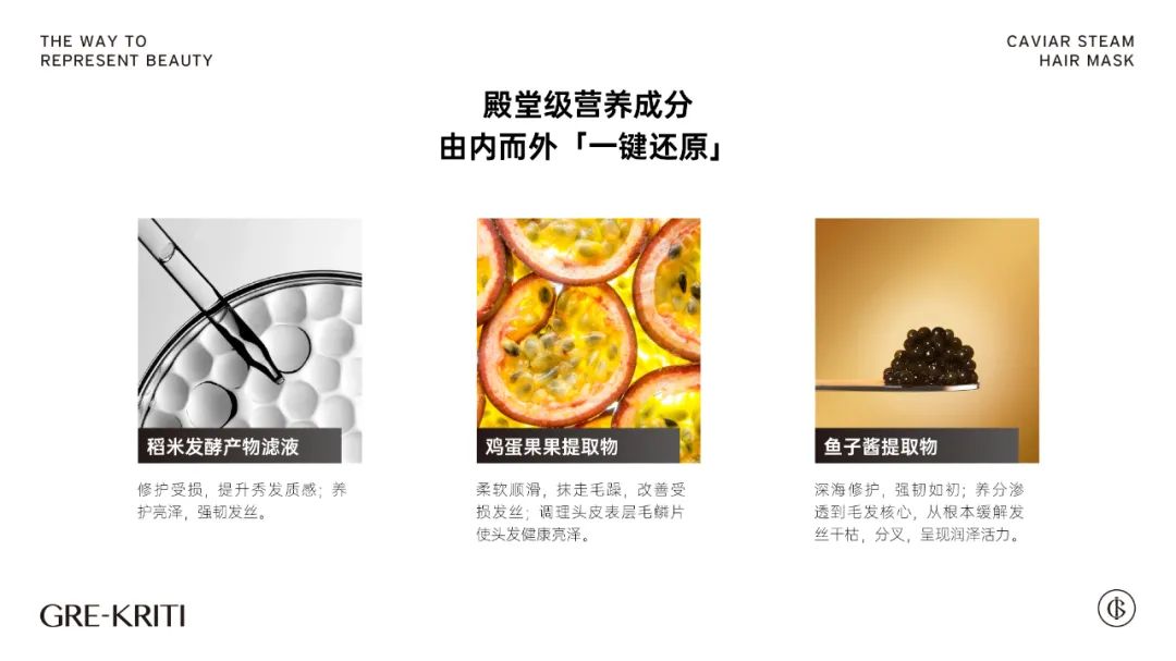 鱼子酱精华:帮助秀发修护亮泽活力,防止秀发老化干枯。