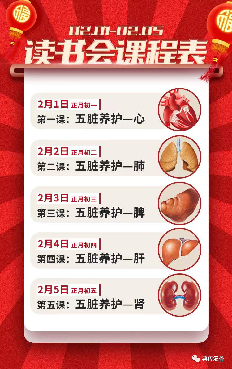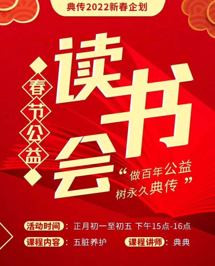 眼瞧着快过新年了,没几天2022年的春节就快到来,在新冠肆虐的大环境里,典典开始了“典传读书会”的筹备工作,并将于春节期间正式启动,为新老朋友定期分享养生方面的知识,同时典典还将邀请医学、运动、武术、经络等各界的养生大家加入我们的“读书会”,为大家分享健康养生之道。