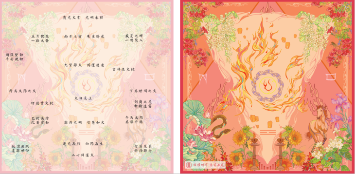 勾勒丙火如太阳般无私照耀,丁火如灯烛般专注传承,午马奔腾之志,巳蛇蛰伏之谋。离卦的光明与九紫吉星的祥瑞交织,助佩戴者闪耀自信,活出生命的璀璨。