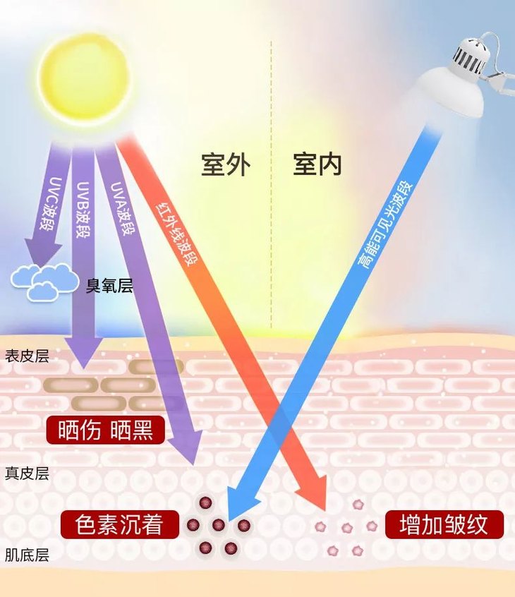 红外线和可见光中的有害光源,对皮肤的影响更深,而且造成的老化损伤基本是不能修复的!