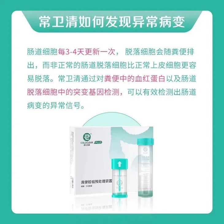 常卫清是一种全新的无创、无痛、无侵入性的一种居家基因检测技术,主要是通过分析粪便DNA,可筛查出一厘米的进展期腺瘤。