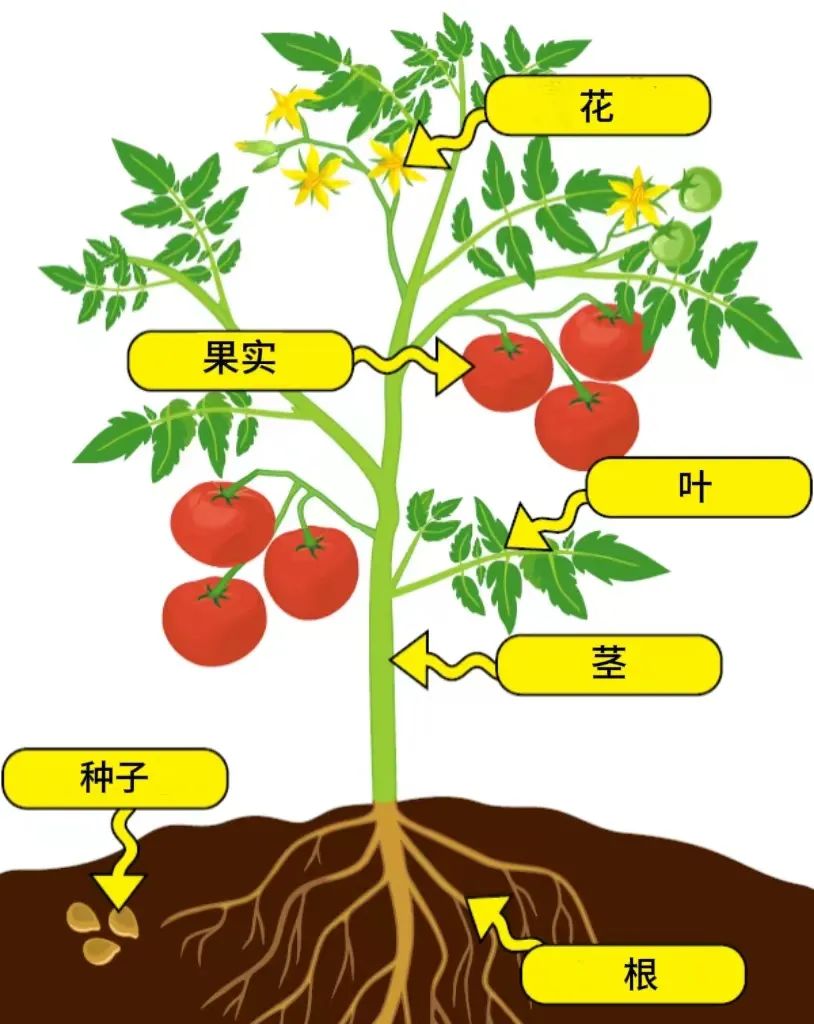 · 根:一般埋在土里,主要功能是吸收水分和养分,固定支持整个植物,同时储藏营养。