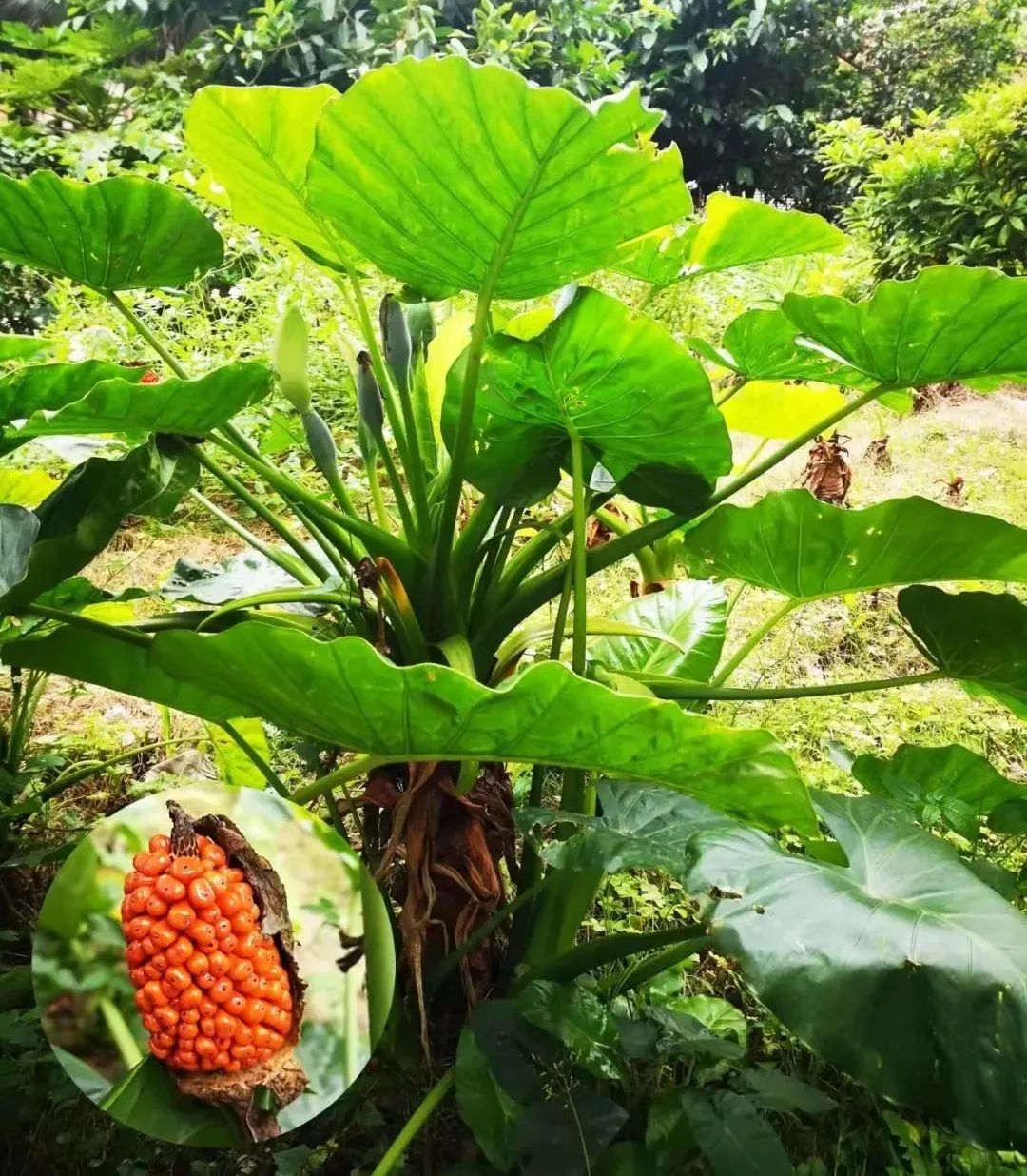 海芋是天南星科海芋属植物,又名滴水观音,是常见观赏植物。海芋的大叶子、红果子、大块茎都很吸引人,不过大家看到后不要好奇上手碰,因为它的茎和叶片里的汁液都有毒,接触后皮肤可能会发麻,起疹子。要是不幸误食,可能引起舌头麻木、肿胀,甚至中枢神经中毒。