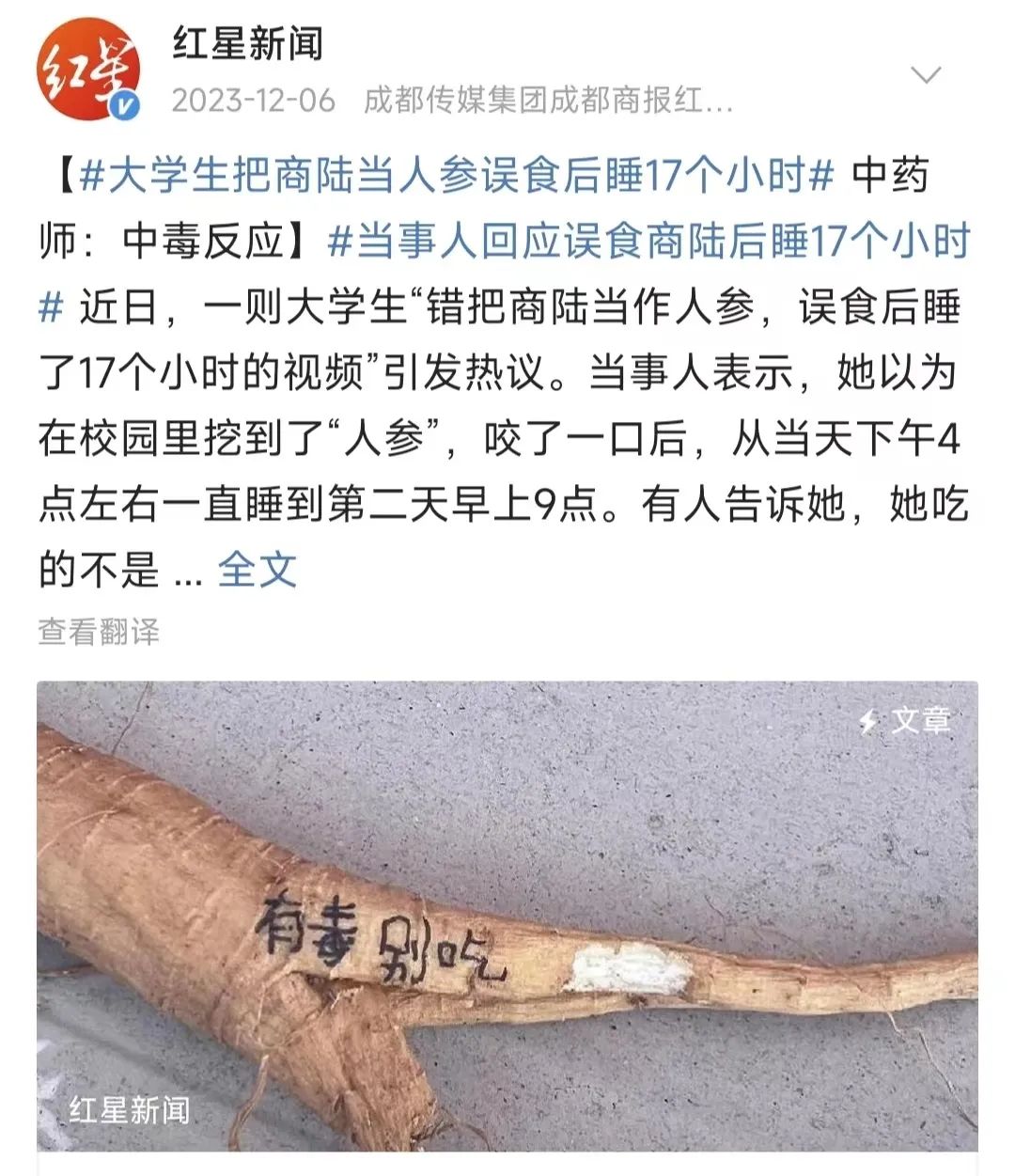 也叫垂序商陆,是商陆科商陆属植物。它原产于北美洲东部,在我国是一种入侵物种,挺泛滥的。美洲商陆全株有毒,根部和果实毒性最强。由于根部像人参,果实像“桑葚”,花朵看起来也挺小清新,这让“亲切”的美洲商陆总能在误食排行榜上占据一席之地。