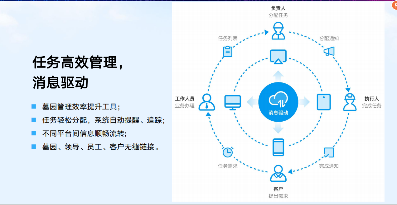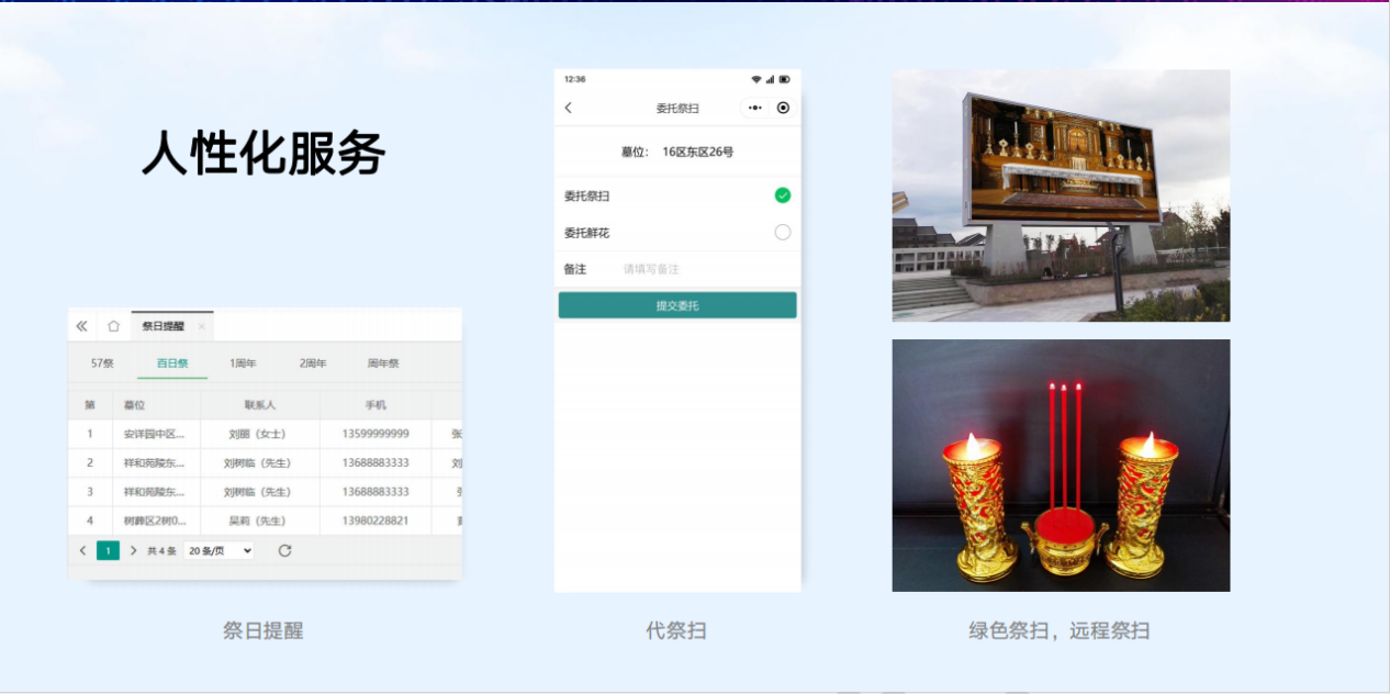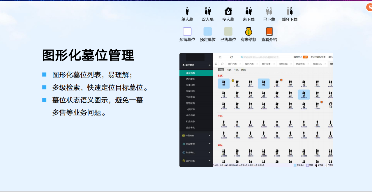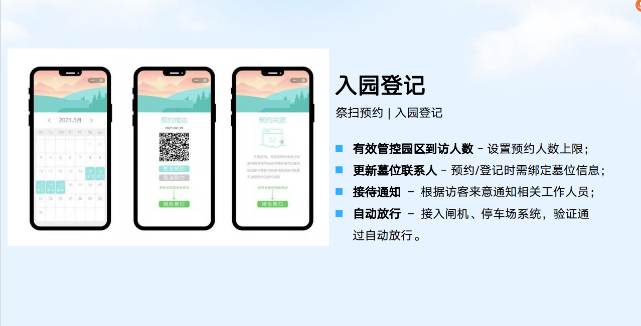 智慧业务管理系统一个核心平台、四个子系统以及五个增值服务产品:PDA/手机选墓子系统、领导审批子系统(手机端)、微信公众号子系统、网站子系统,五个增值服务产品包括网上纪念馆-孝悌堂、预约通小程序(陵园预约祭扫服务),全景墓园、一墓一码、网上商城,可与核心管理平台进行无缝对接,全方位、多维度提升墓区的整体管理水平。