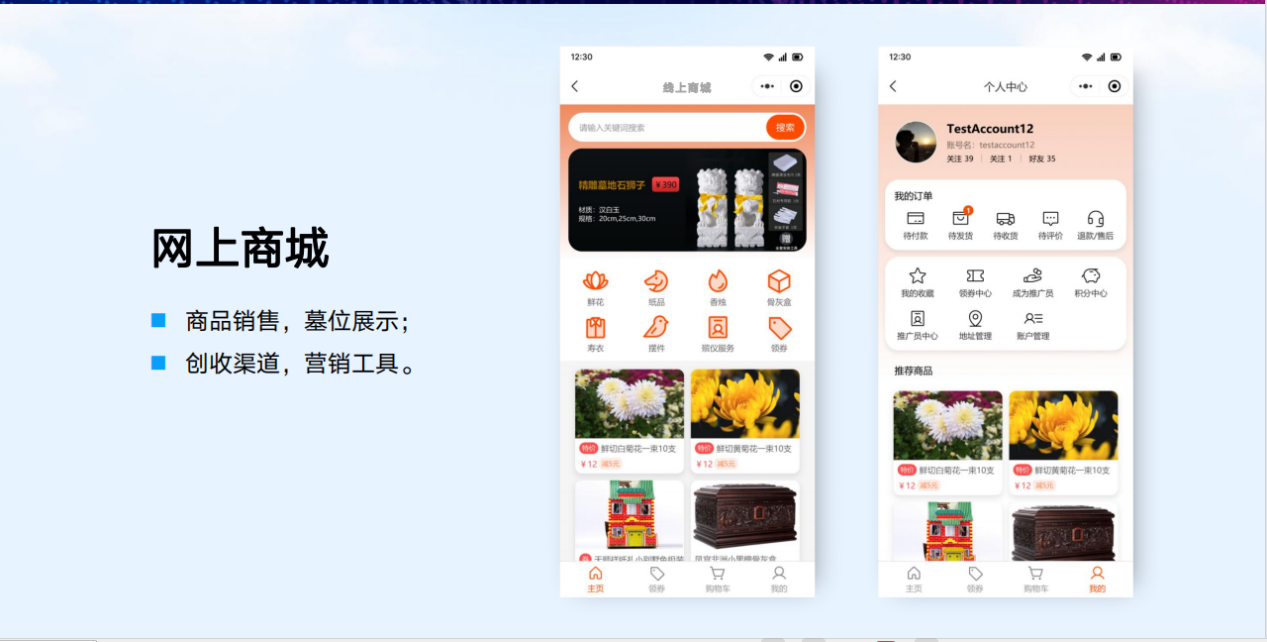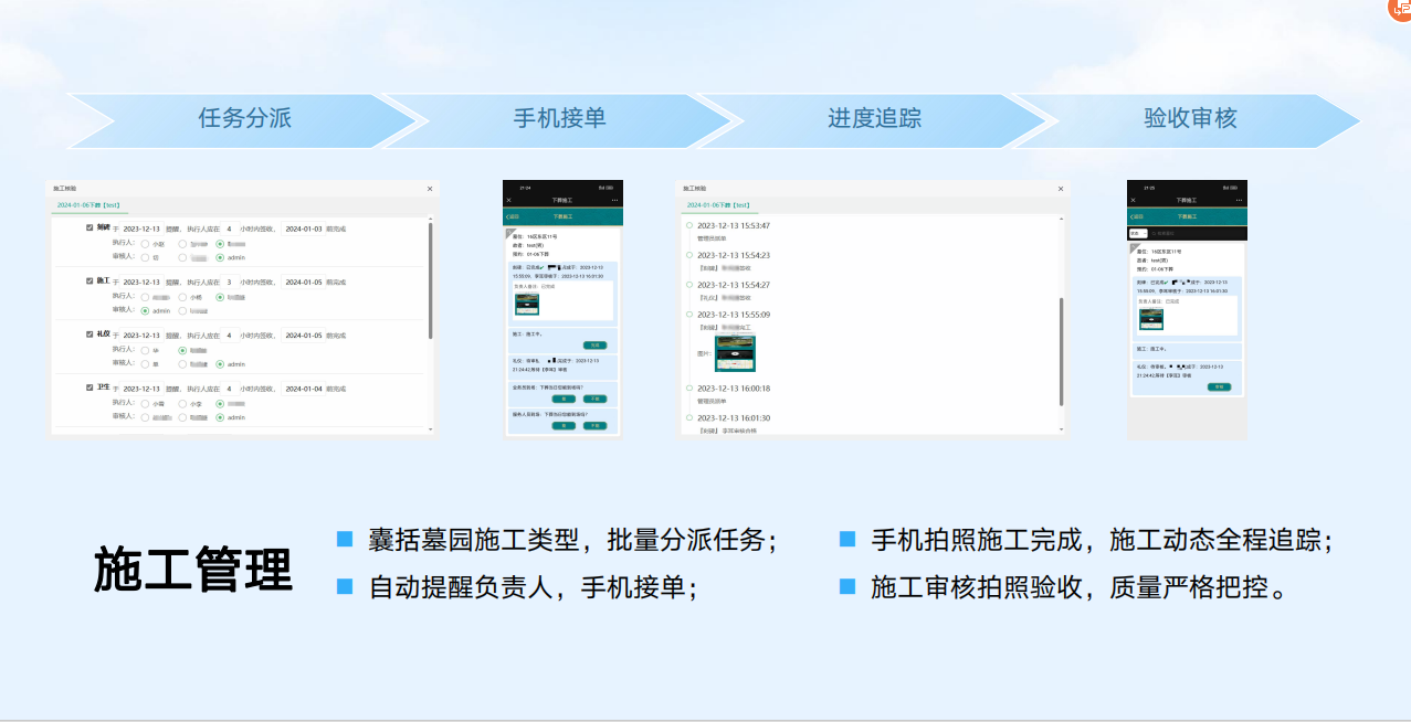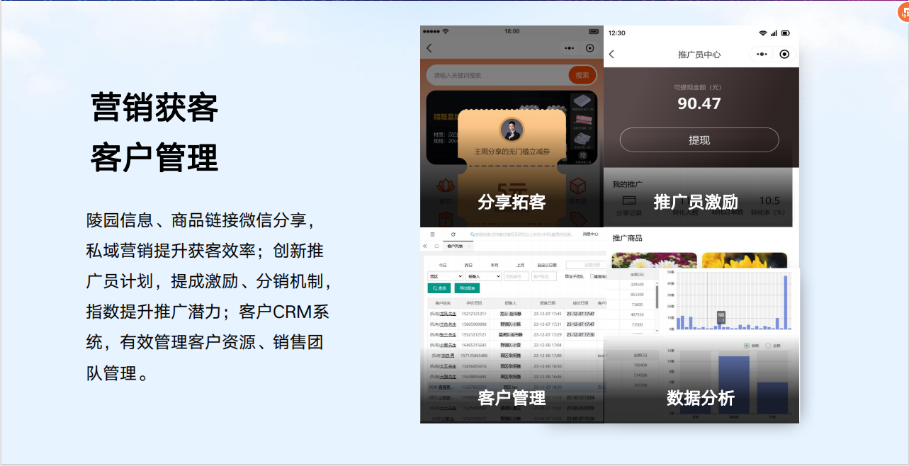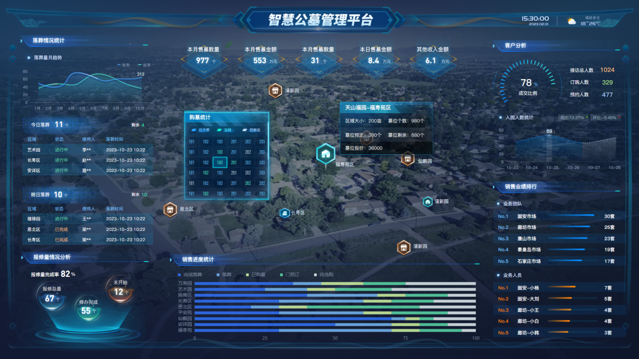 智慧业务管理系统一个核心平台、四个子系统以及五个增值服务产品:PDA/手机选墓子系统、领导审批子系统(手机端)、微信公众号子系统、网站子系统,五个增值服务产品包括网上纪念馆-孝悌堂、预约通小程序(陵园预约祭扫服务),全景墓园、一墓一码、网上商城,可与核心管理平台进行无缝对接,全方位、多维度提升墓区的整体管理水平。