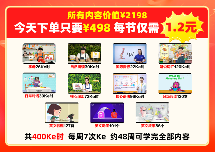 📚 配套资源(无基础):396个课时+120本分级阅读+127首英文歌谣+101个趣味动画+86个英文故事