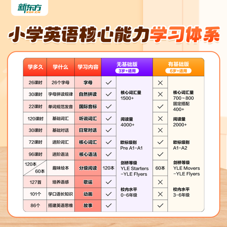 🌟无论孩子是零基础还是有基础,新东方小学英语核心能力课程都为他们准备了最适合的学习路径,48周/27周轻松搞定小学英语,让家长不再为英语学习烦恼!💼📚