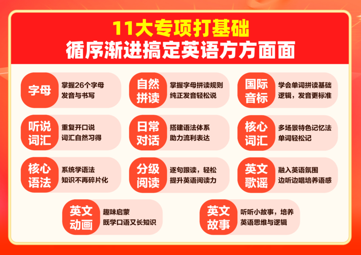 1️⃣ 11大专项核心能力,涵盖字母、自然拼读、国际音标、日常对话、核心词汇、语法等,全面提升孩子的英语能力