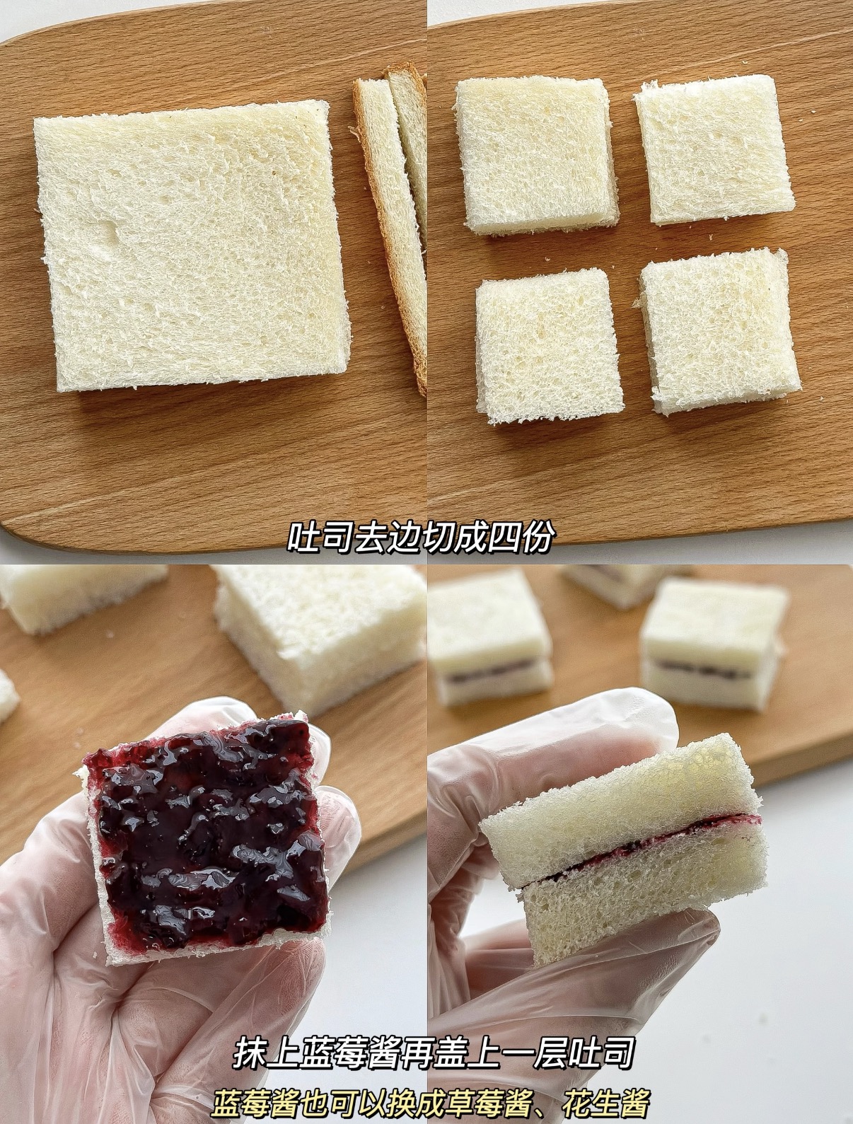 1️⃣吐司去边切四块,涂抹上果酱,盖上另一片