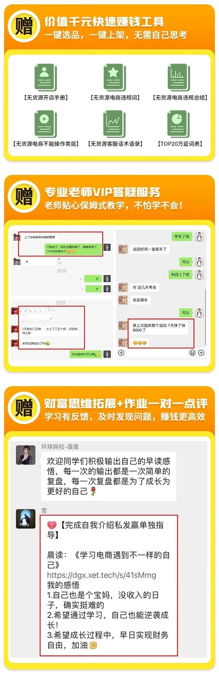 “至于怎么选产品,标题怎么写,怎么不花钱就有流量,怎么找上游货源......这些统统在这个课里能学,才一块钱。你去听听就会了。”