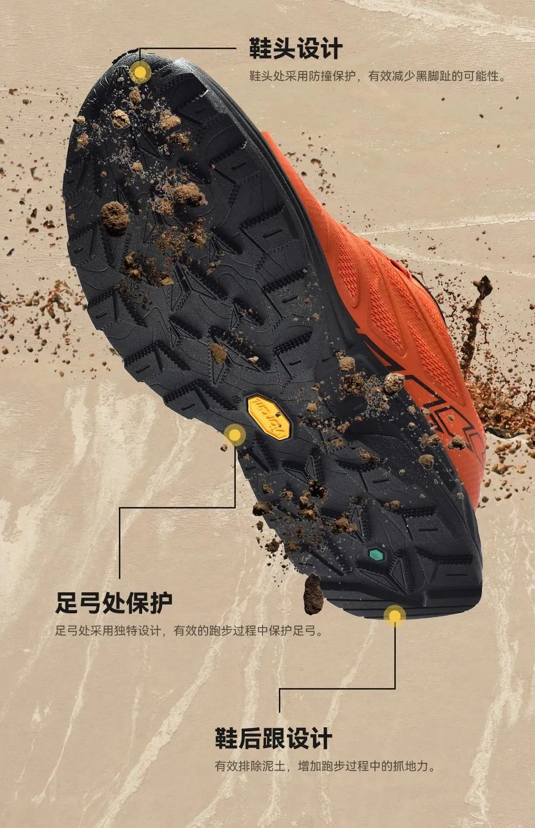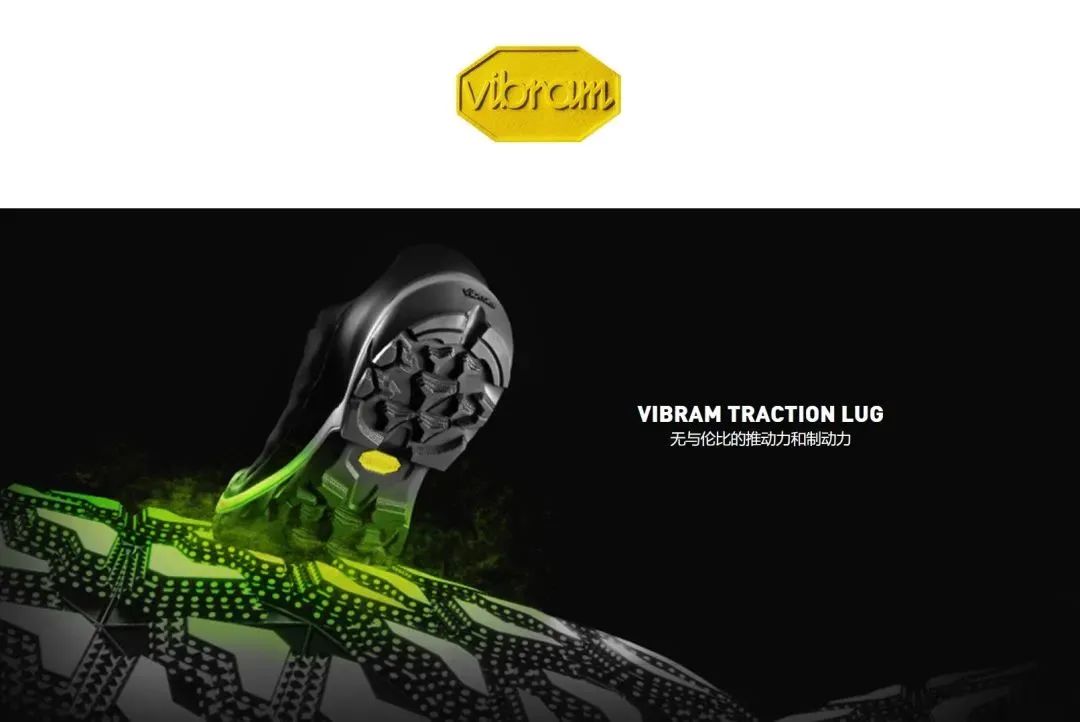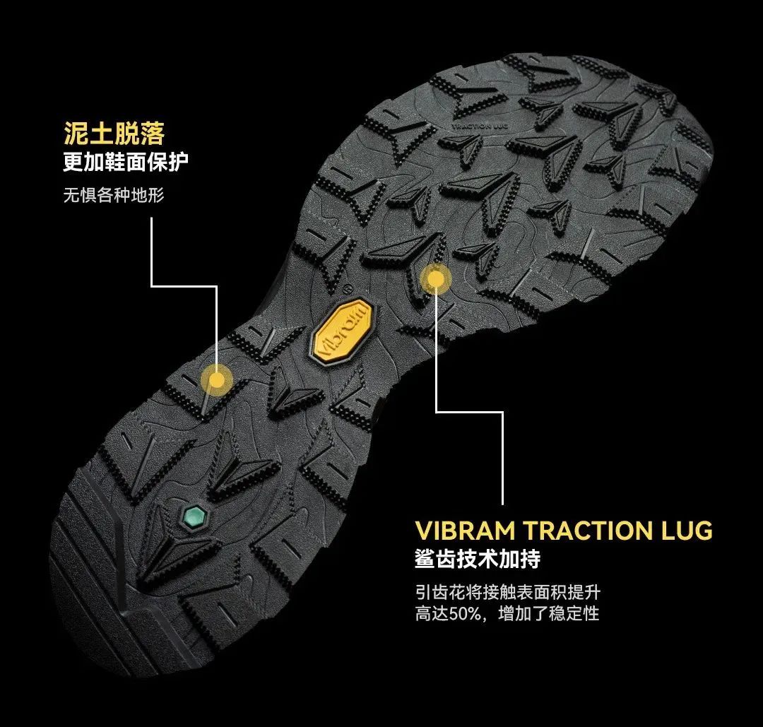 VibramTraction Lug 鲨齿技术的创新设计牵引齿花将接触表面积提升高达50%,增强了稳定性,牵引力提高25%。轻松应对各种户外路面,提供无与伦比的推动力和制动力。