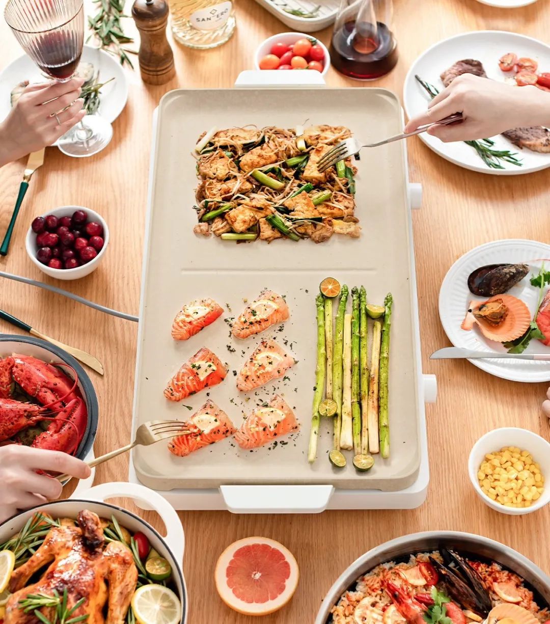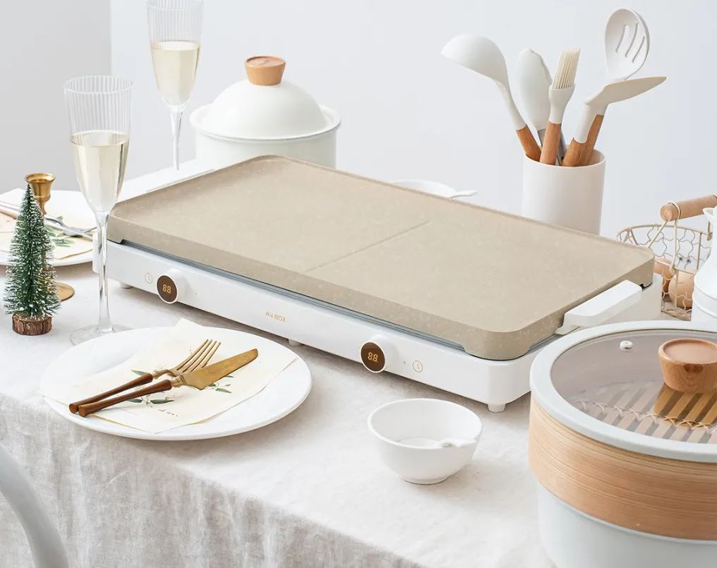适盒IH聚嗨炉烤盘面积大,能容纳6-8个人,好友小聚也够用。可以同时烤蔬菜和肉类,它有两个灶,左右分盘,火候大小可以独立控制,互不影响,方便快捷。