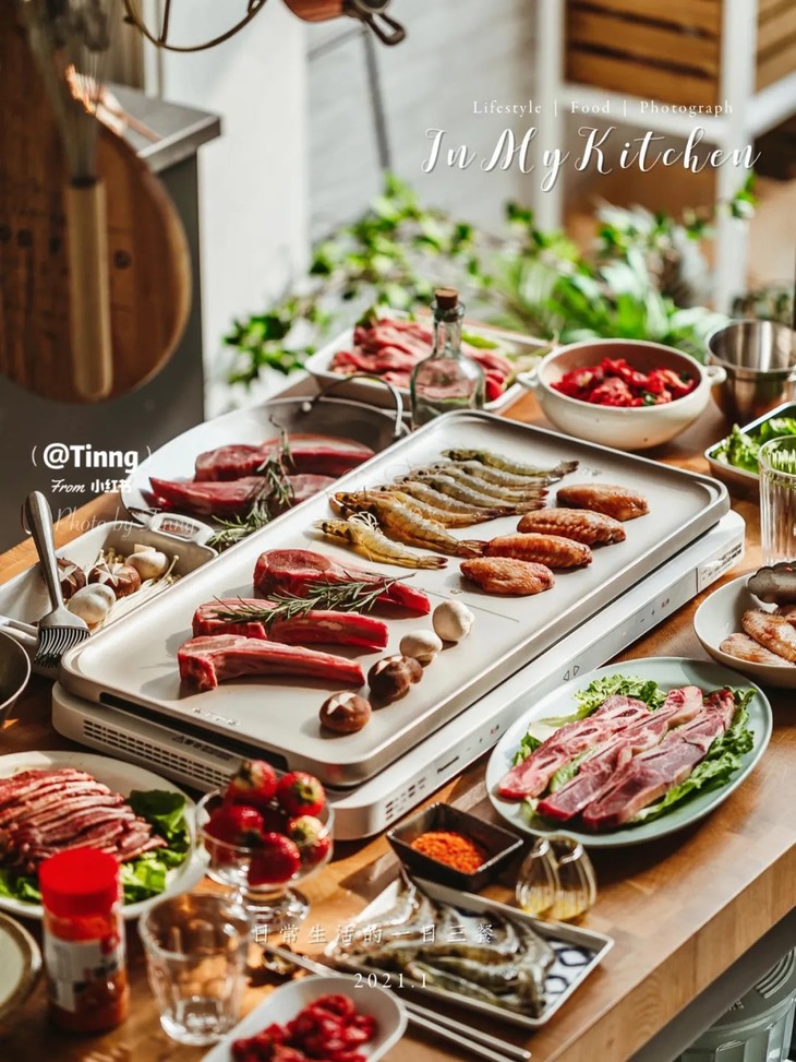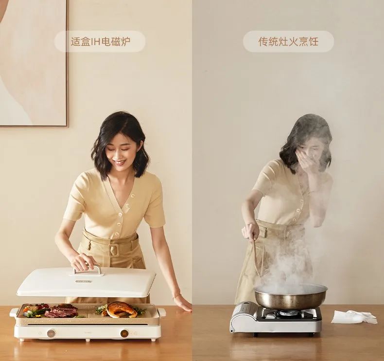 一般来说,油量多,外加局部温度高,就会产生油烟。适盒这款聚嗨锅烤盘采用麦饭石材质,炒菜、烤肉本身需要的油就很少,还有9档精准控温,所以比传统的灶火烹饪油烟小得多。