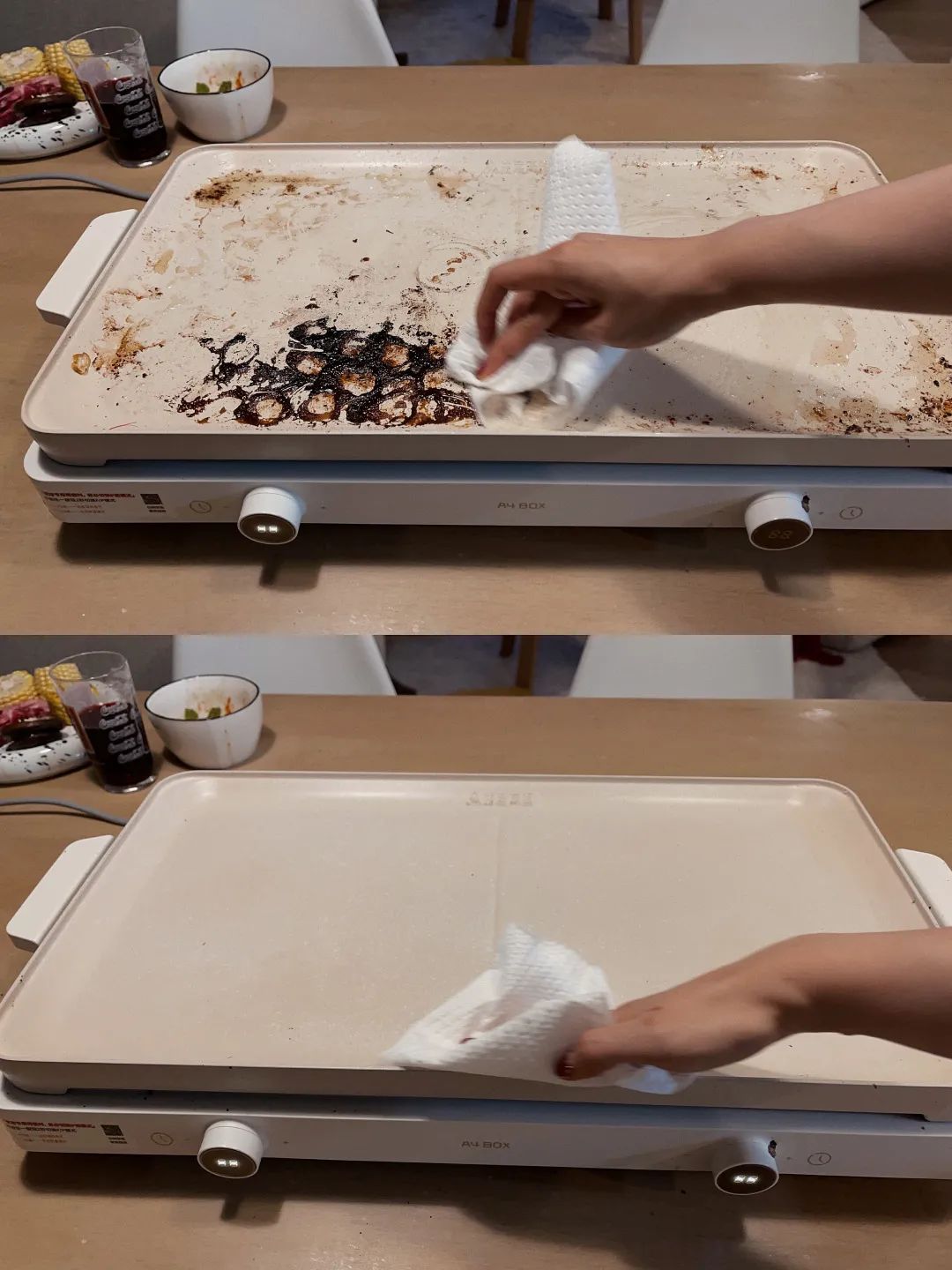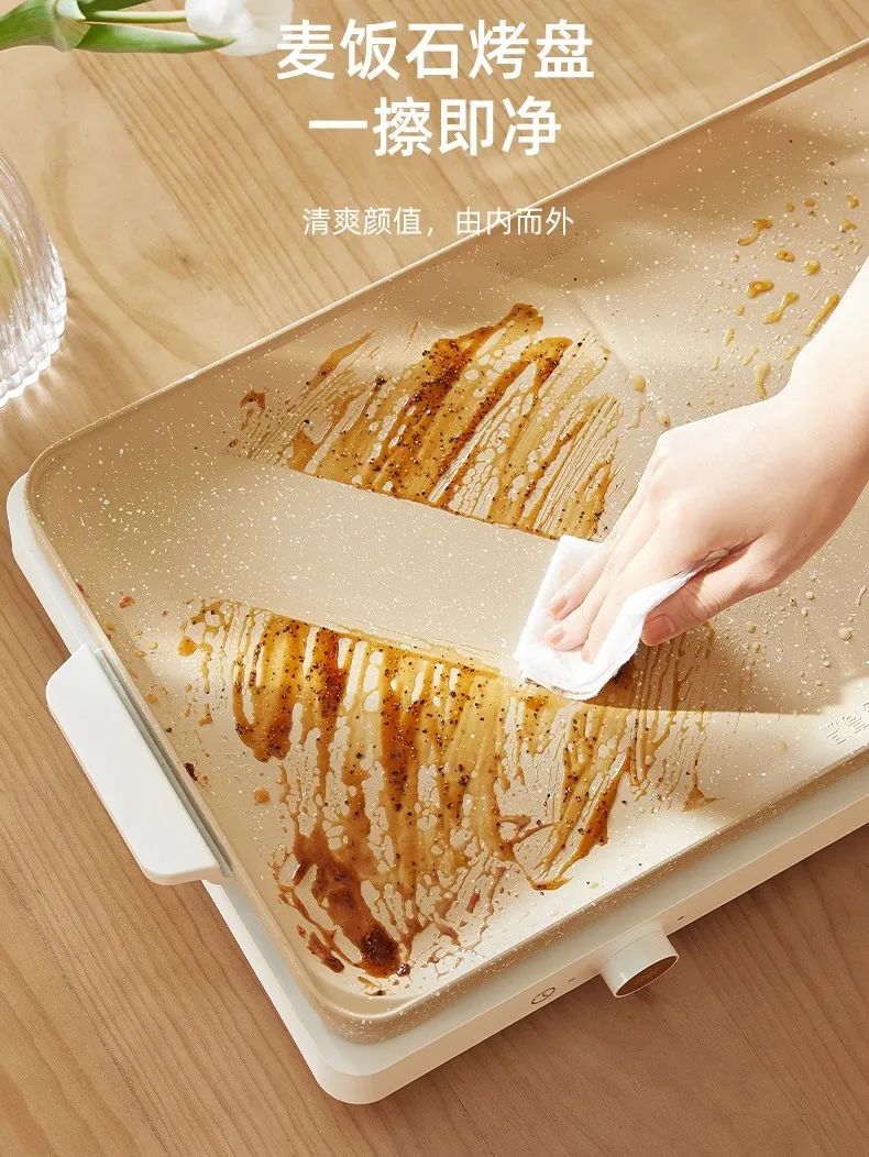 烤盘采用麦饭石材质,不容易粘锅,一擦就净。