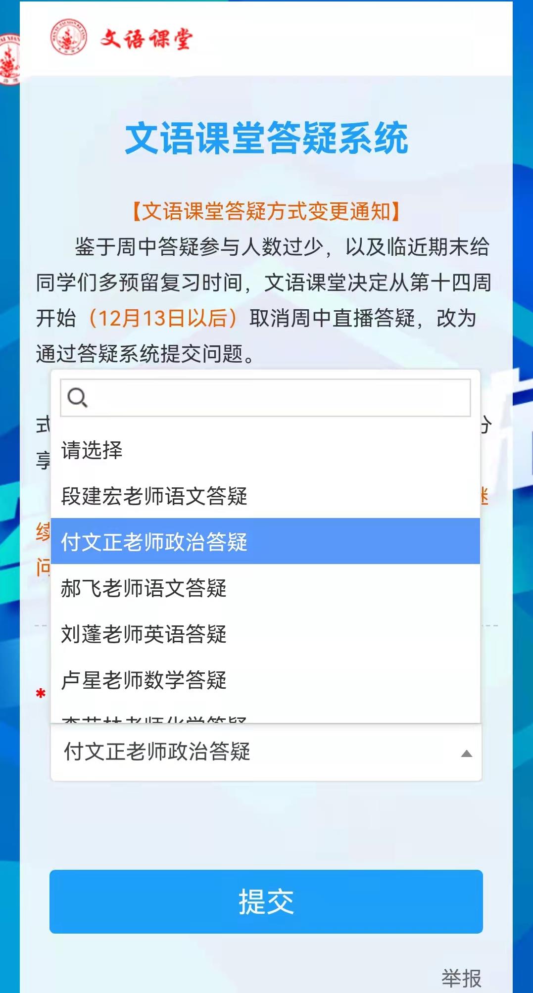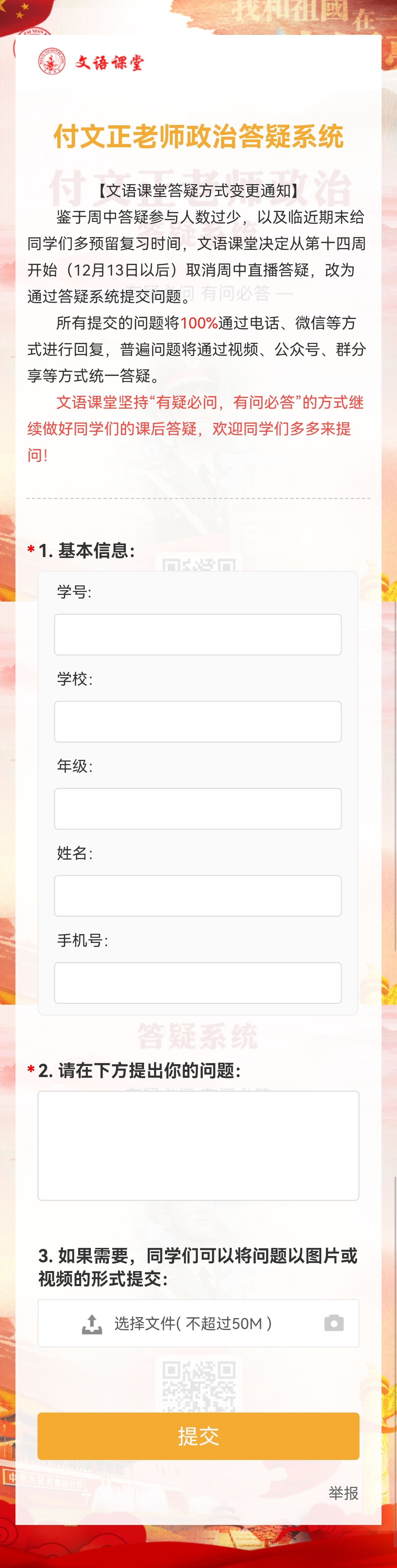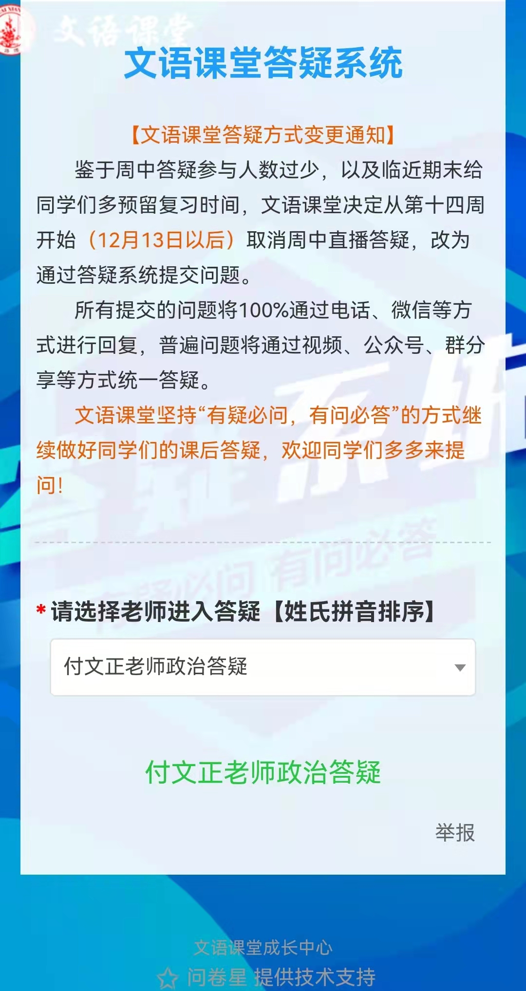 鉴于周中答疑参与人数过少,以及临近期末给同学们多预留复习时间,文语课堂决定从第十四周开始(12月13日以后)取消周中直播答疑,改为更为高效的答疑系统。
