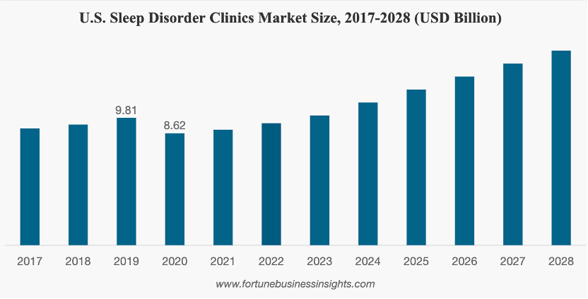政府和公共卫生组织通过一系列举措来提升人们对于此类疾病的认知,也出台了对睡眠测试和治疗服务的有利报销方案,促使睡眠障碍市场迎来大规模增长。根据财富商业洞察统计,2020年美国睡眠障碍诊所市场规模为86.2亿元,预计该市场将从2021年的92亿美元以8.2%的复合增长率增至2028年的159.2亿元。