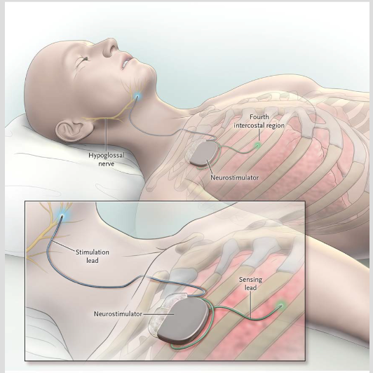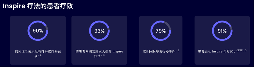 Inspire疗法是经FDA获批的完全植入体内的小型装置,用于治疗睡眠呼吸暂停。该装置被置于皮下,可以感知患者呼吸状态并提供轻度刺激以保持睡眠期间的呼吸道顺畅。Inspire装置由神经刺激器、压力传感导线和刺激导线三部分组成,并由小型手持式睡眠遥控器控制。遥控器可以打开/关闭治疗和调整刺激强度。由于舌下神经控制舌头和气道其他肌肉的运动,Inspire会刺激舌下神经,使舌头和其他肌肉组织离开气道,保持呼吸顺畅。开启Inspire后舌头会有轻微刺激感,但不会带来疼痛或不适。