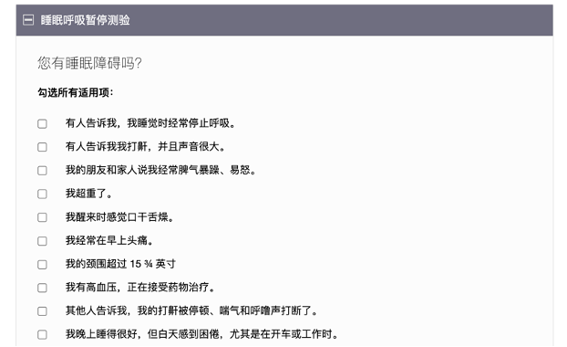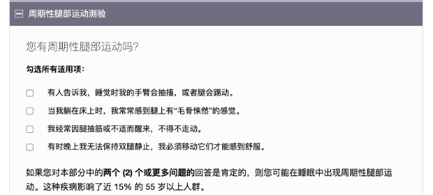 在线下中心就诊之前,患者可通过官网进行睡眠自我评估,帮助医生快速了解患者的睡眠状况,从而节省线下沟通时间。评估内容涵盖睡眠呼吸暂停、失眠、嗜睡等多种病症,每种病症都有特定问题。自我评估的结果仅为参考,不能替代专业诊断,患者仍需通过线下诊断测试,由专业医生结合详细的检测结果进行科学判断和后续治疗方案的制定。