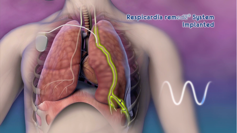 Respicardia 疗法是一种针对中度至重度中枢性睡眠呼吸暂停的植入式疗法。这种系统通过刺激膈神经,向横膈膜传递信号,模仿大脑对呼吸的自然控制。经过培训的心脏病专家会将一个小型装置植入胸部上部的皮下,并将细导线插入膈神经附近的血管中。装置会在患者睡眠时监测其呼吸信号,并刺激神经移动横膈膜以恢复正常的呼吸模式。