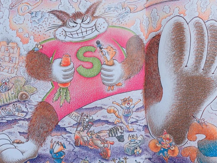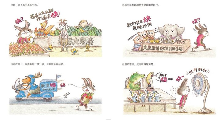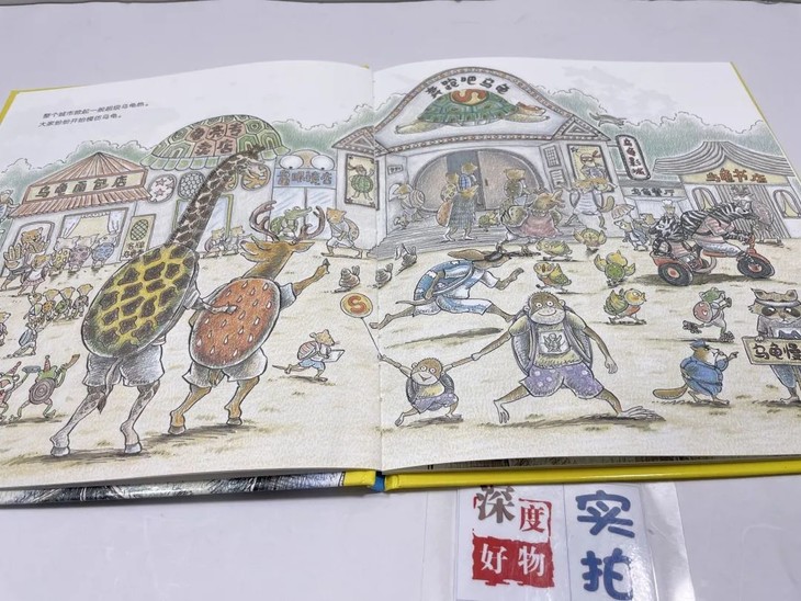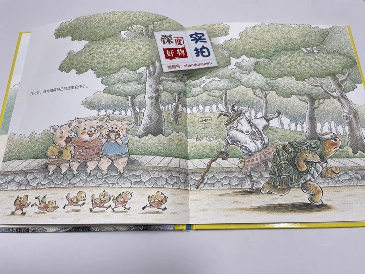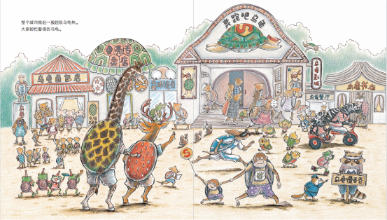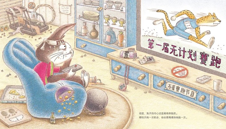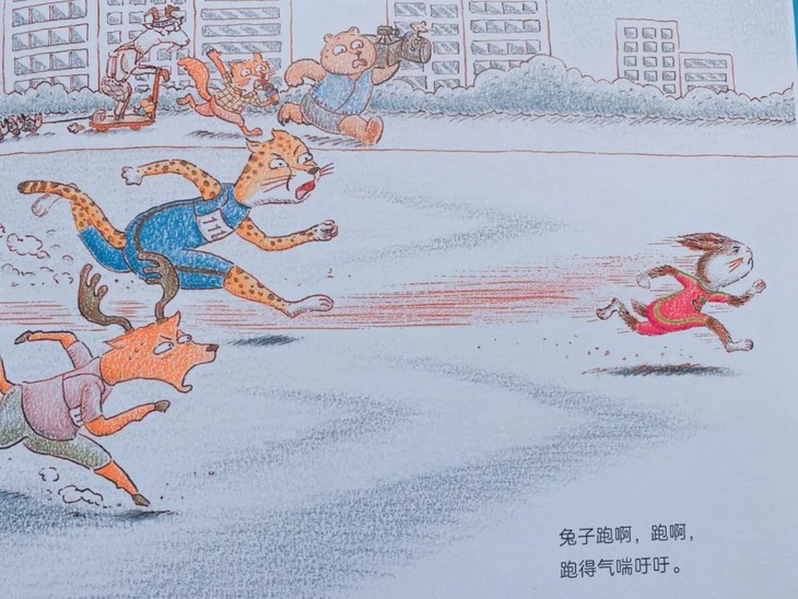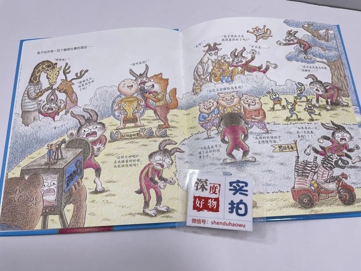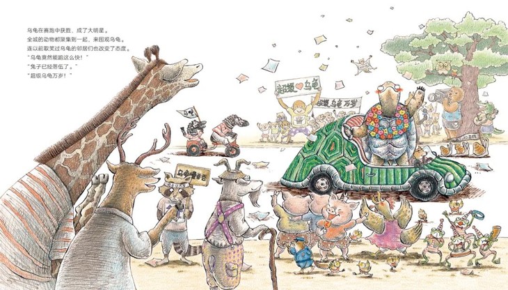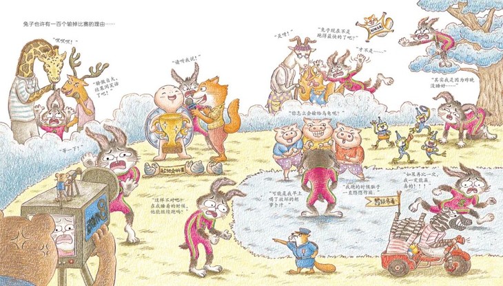 书中插图细节非常用心和精彩,比赛中其他动物们的手幅、乌龟和兔子的广告牌、乌龟提速的场景、兔子拒绝奔跑的场景、记者熊的摄像机等。