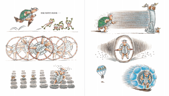 乌龟像个铁憨憨,既认真,又努力,看上去好笑又心酸。只要有提高速度的方法,他都会去尝试,每天都努力地训练,终于,他跑得越来越快了。