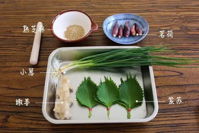 紫苏 10~20片、茗荷 3~5个、嫩姜 1~2片、小葱 适量、熟白芝麻 适量。