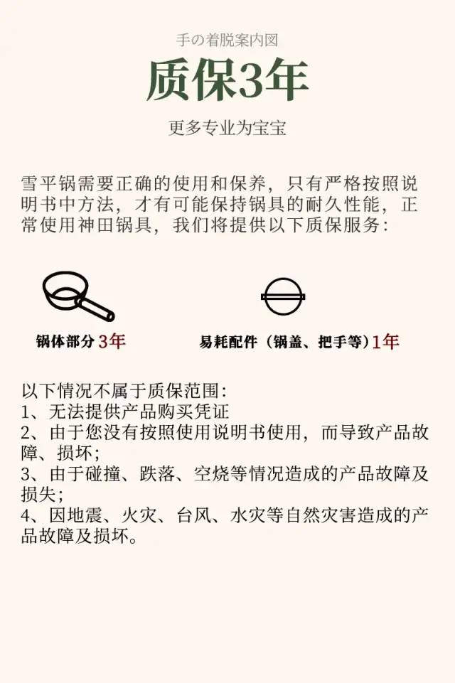神田不愧是注重品质也敢于承诺的大品牌,市面上的大部分雪平锅很容易出现泛黄发黑的问题,所以质保时间都只有几个月,而这款神田雪平锅,锅体质保长达3年(配件1年质保),完全不用担心售后问题。