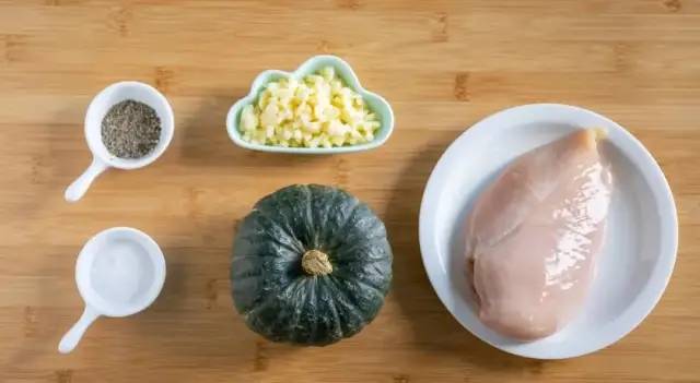 食材:鸡胸肉300g、南瓜100g、马苏里拉奶酪20g、黑胡椒适量、盐适量。
