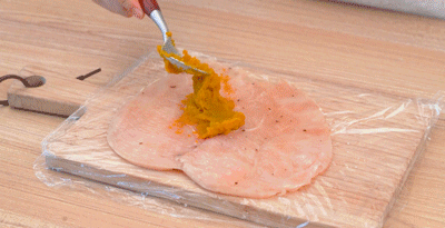 3、蒸好的南瓜用勺子挖出,压成南瓜泥。在鸡胸肉表面均匀铺上一层南瓜泥,放上马苏里拉芝士,借助保鲜膜慢慢卷成肉卷,卷好后利用保鲜膜定型5分钟。