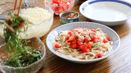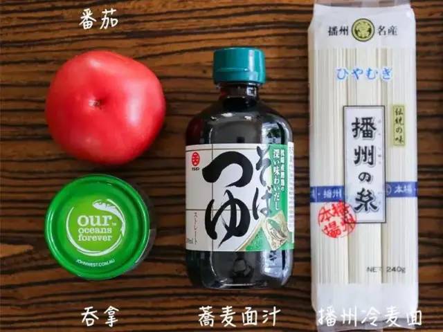 食材:100g蔬菜面,一个番茄,吞拿鱼一罐,番茄150g,日本素面,番茄 1个,日本面汁100ml,冰水适量;