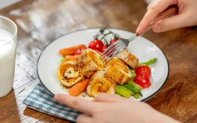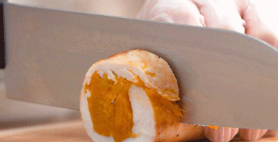 5、稍微放凉一点,切成小卷,即可享用。只用了盐和黑胡椒调味的鸡胸肉,混合了南瓜泥的清新香甜,入口弹、嫩、软、糯,给了味蕾一个小惊喜。