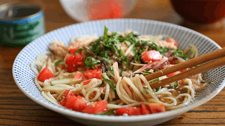4、将冰水中的冷面捞出装盘,加入适量日本面汁,再加入等量冰水。将番茄丁、黄瓜丝、吞拿鱼块、混合香料、芝麻碎依次放到面上,美美的午餐面条做好啦。