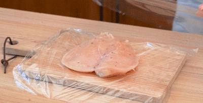 2、鸡胸肉从中间用刀慢慢片开,撒上盐和黑胡椒粉,腌制10分钟。将腌好的鸡胸肉两面盖上保鲜膜,用肉锤或者擀面杖均匀敲打,把鸡胸肉敲大敲薄一些。